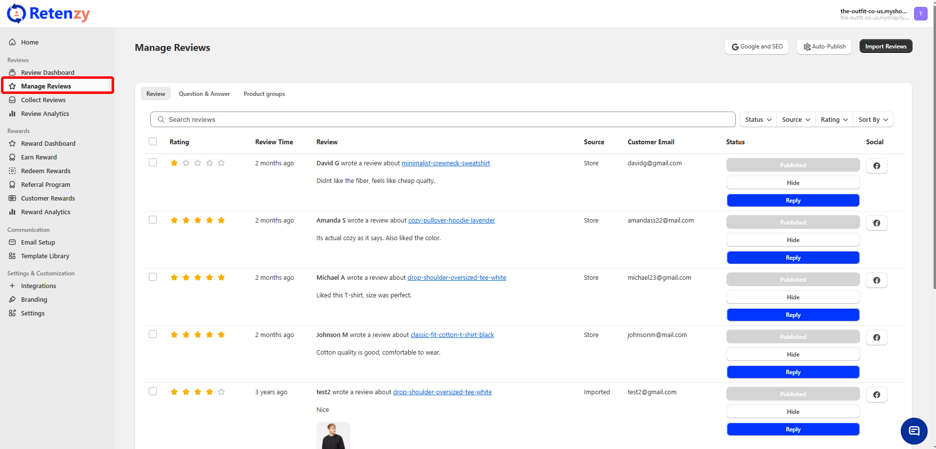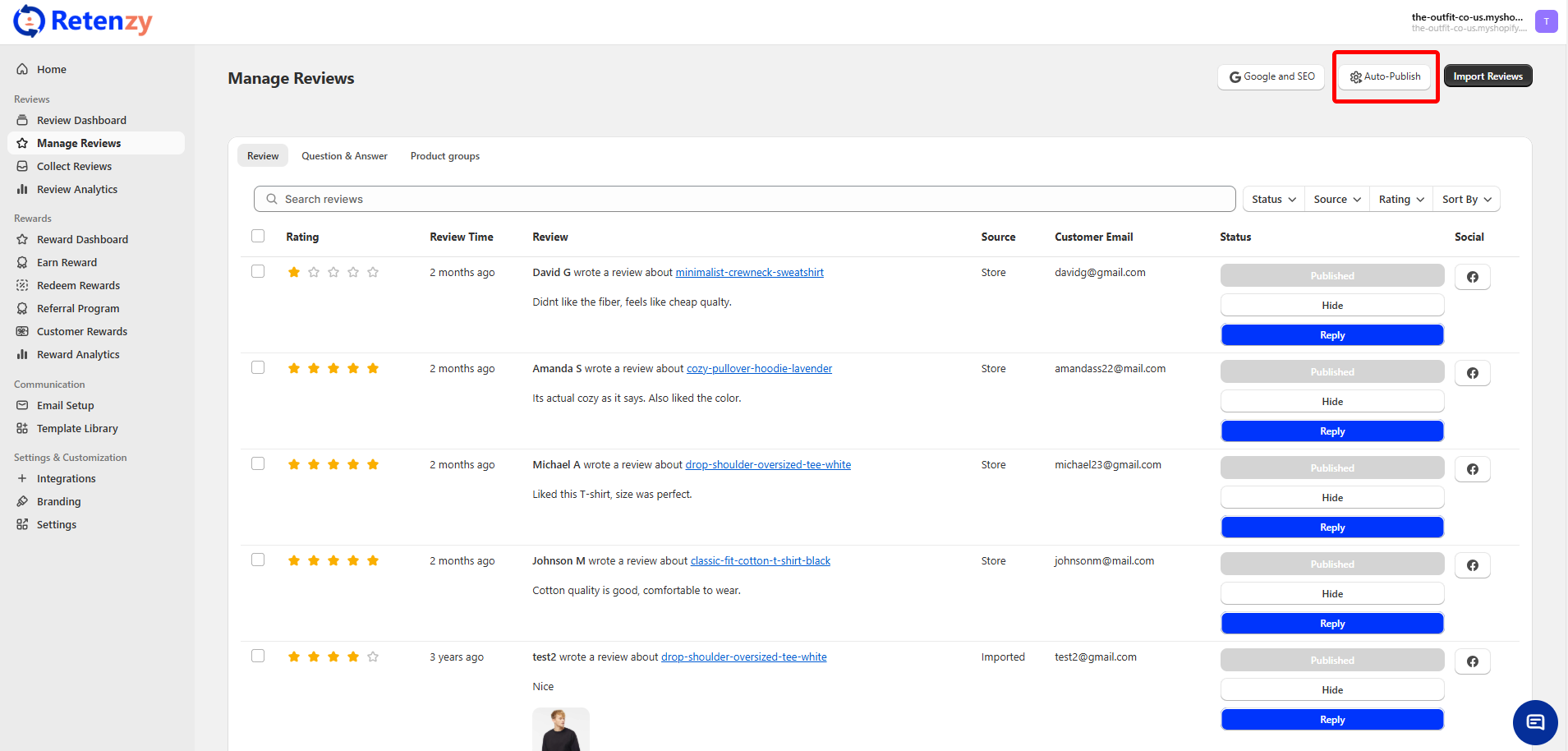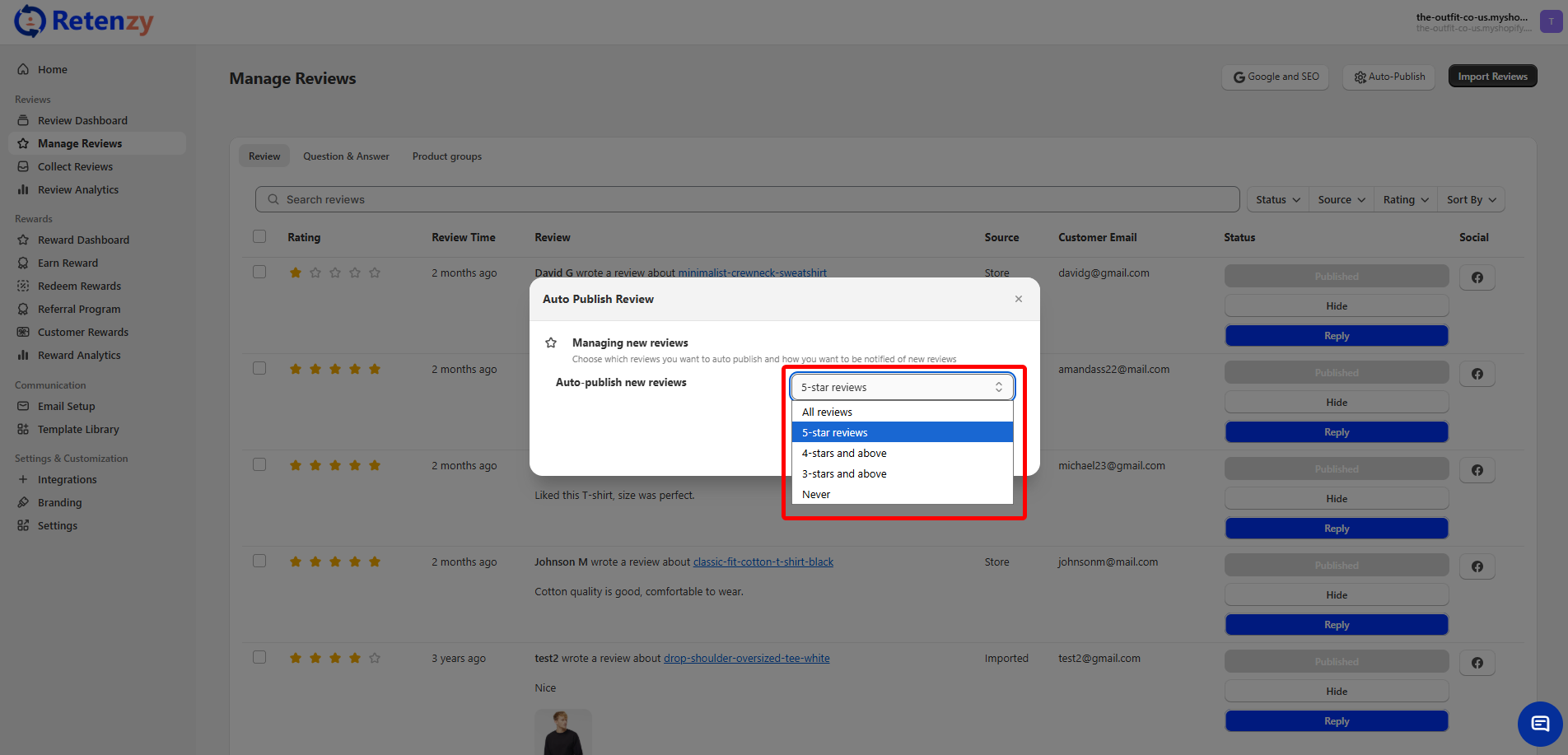 The “Auto publish reviews” feature in Retenzy allows you to automatically publish only the reviews that meet your preferred rating criteria. This helps maintain your store’s reputation while still collecting valuable feedback.
