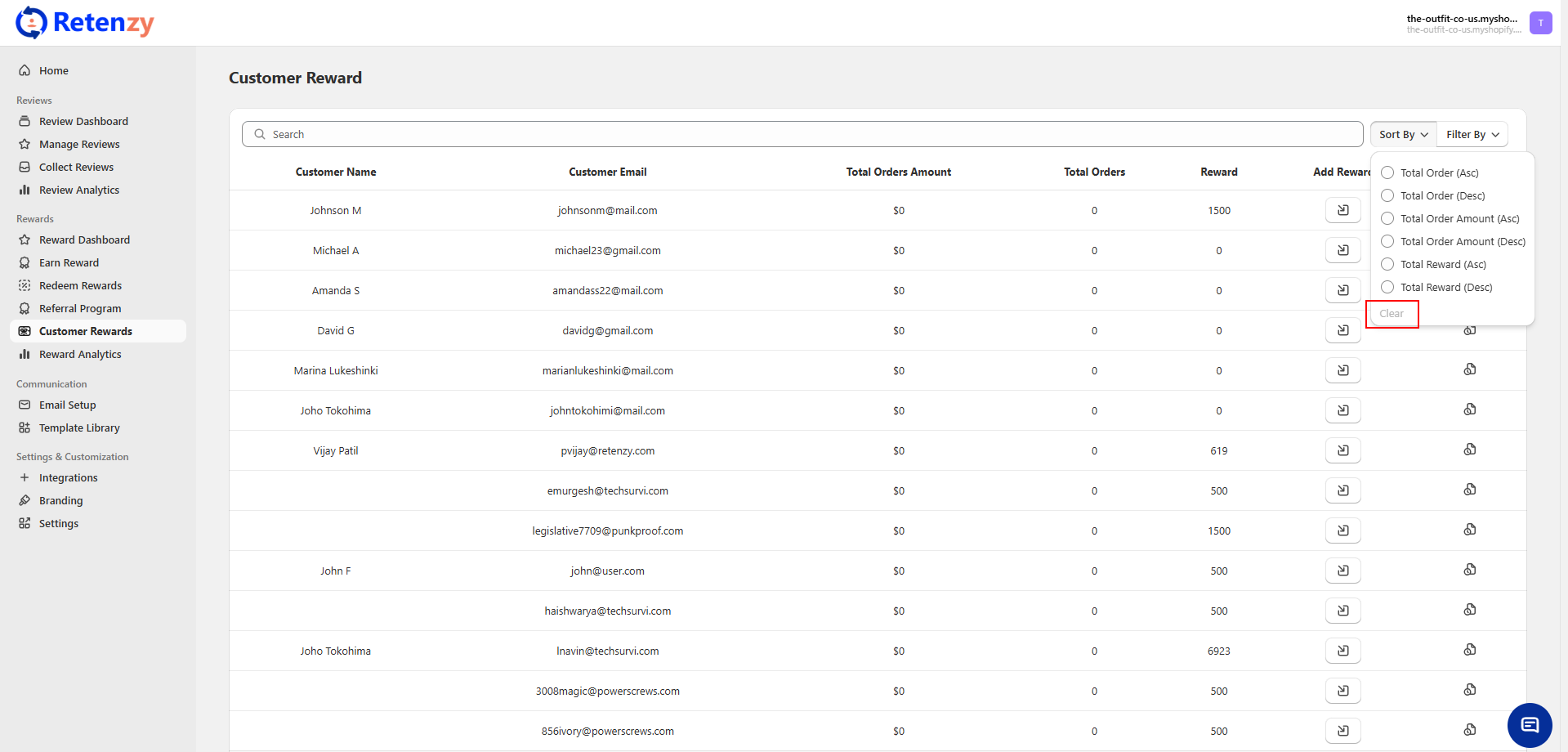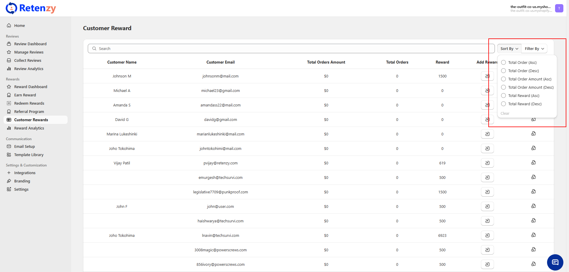 The Customer Rewards dashboard allows you to sort customers based on their total orders, total order amount, or total rewards. This makes it easier to identify top customers, high spenders, or the most rewarded users.