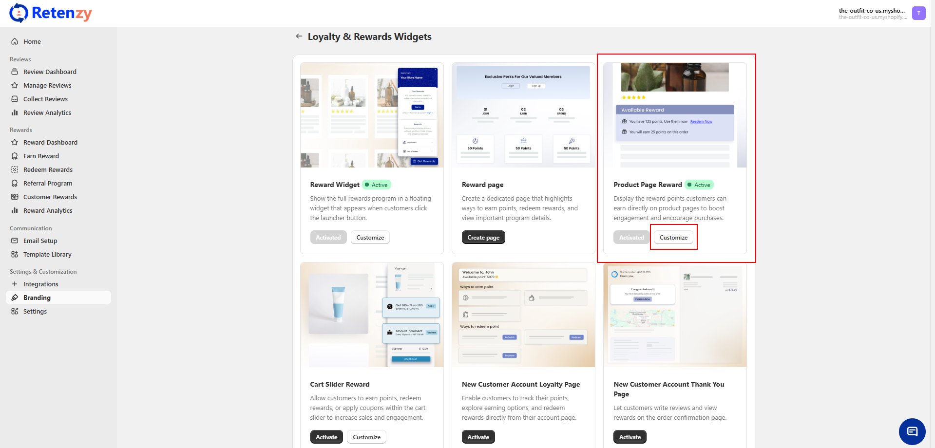 Find the product page reward and click on customize.
