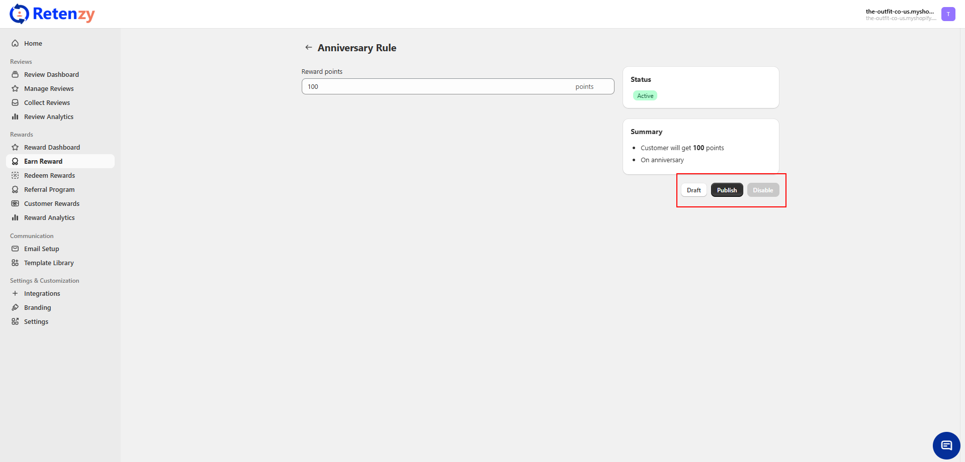 Set the rule status by clicking on Publish. This will activate the Anniversary Reward Rule.