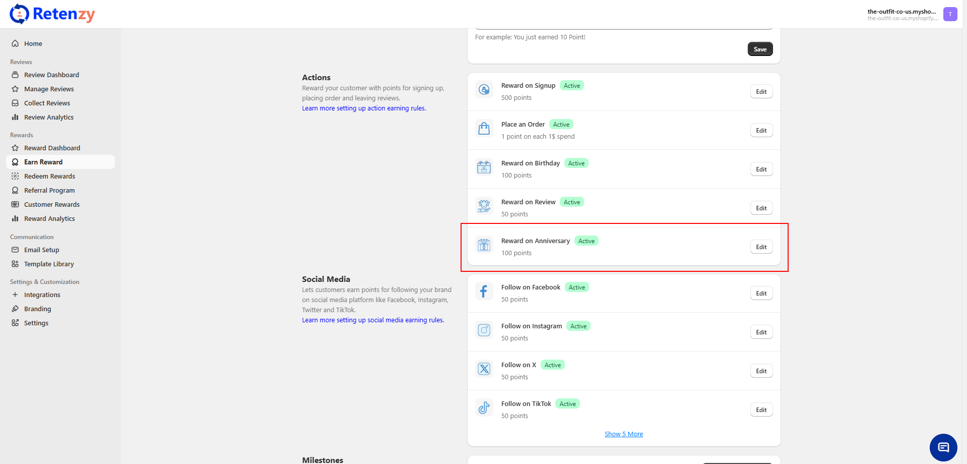 From the Earn Reward page, click on the Edit option of the Reward on Anniversary to open the setup page.