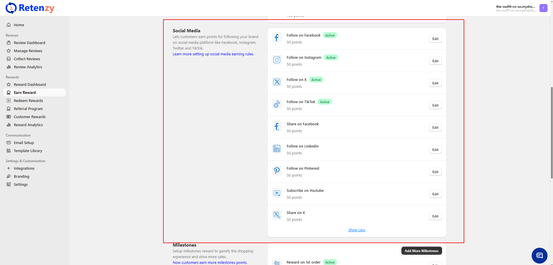 From the Earn reward page, select the social media platform for which you want to create the rule and click on Edit. (e.g., Facebook, Instagram, etc.).