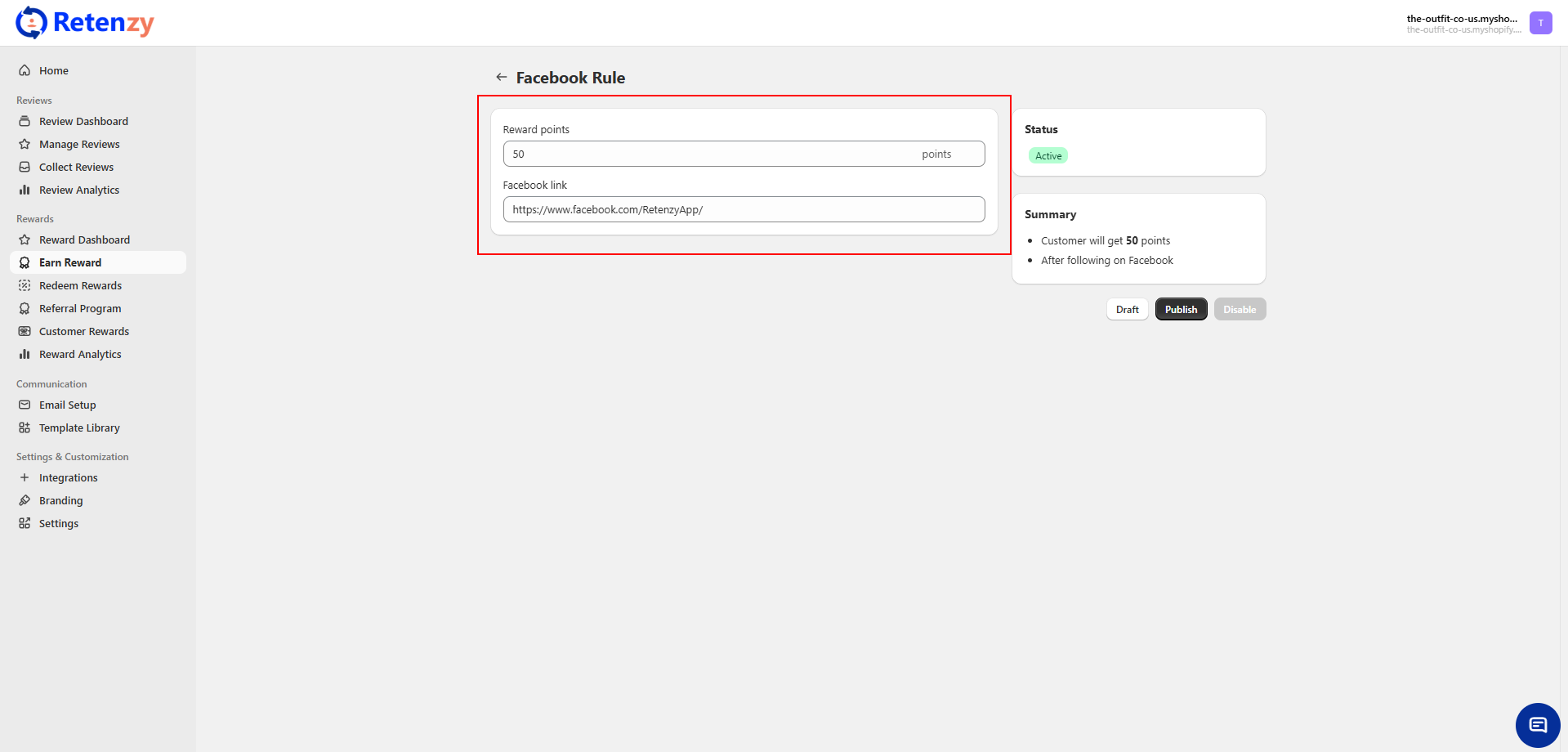 Enter the number of reward points you want to give when a customer follows or shares your page.