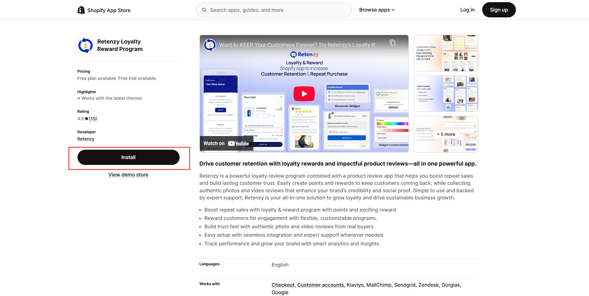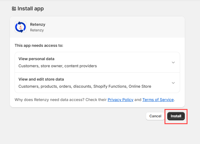 On the Retenzy app page, click the “install” button