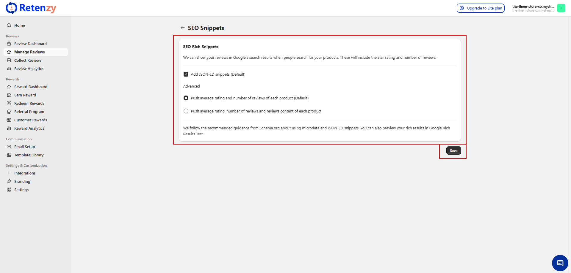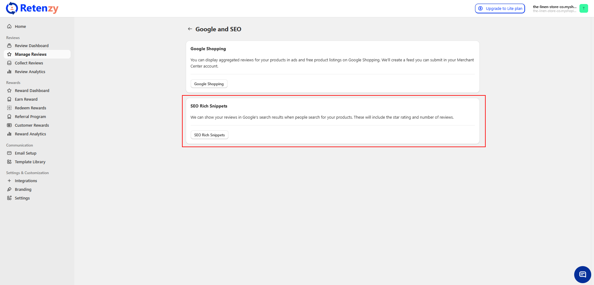 The Google Rich Snippet feature allows your reviews to appear directly in Google’s search results when people search for your products. This includes star ratings, the number of reviews, and, optionally, review content, helping boost visibility, credibility, and click-through rates.