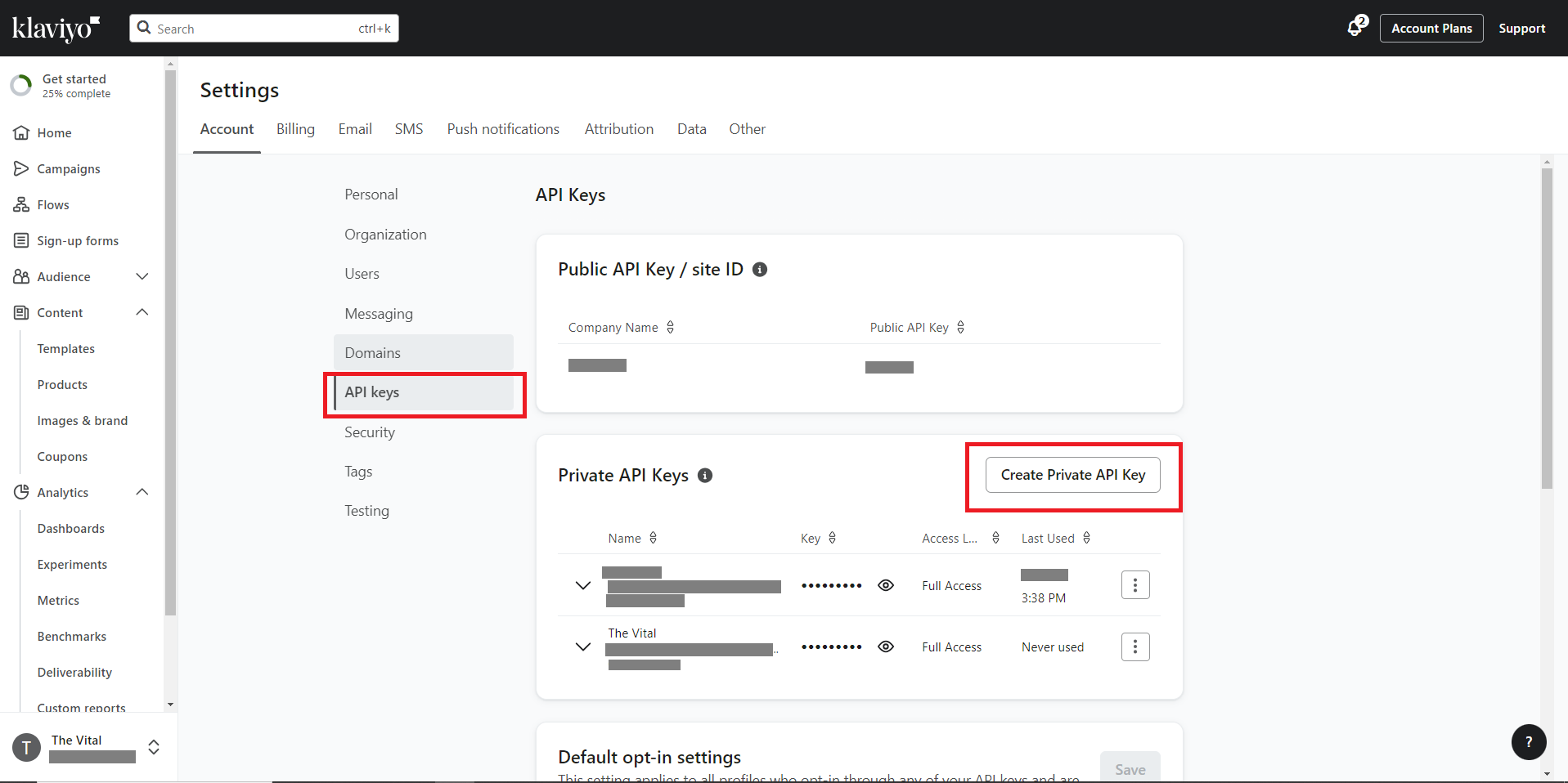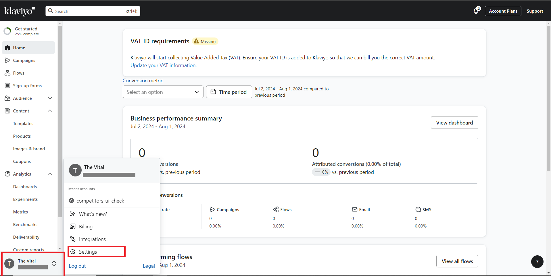 Step 2: Go to your Klaviyo account, click on your username and choose Account And Click On Settings.