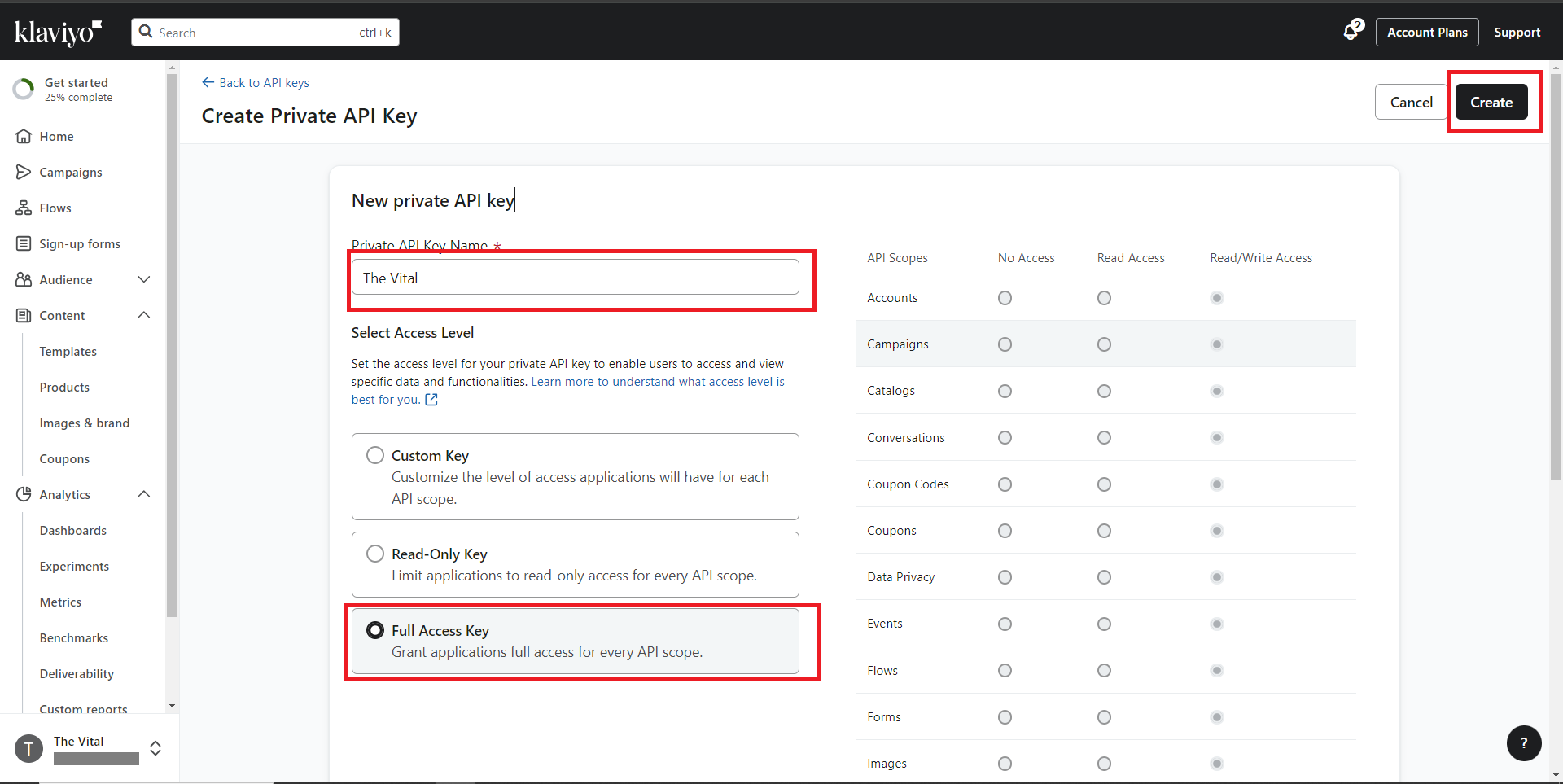 Step 4: Give name to API key ,click on Full Access Key and Click on Create button.