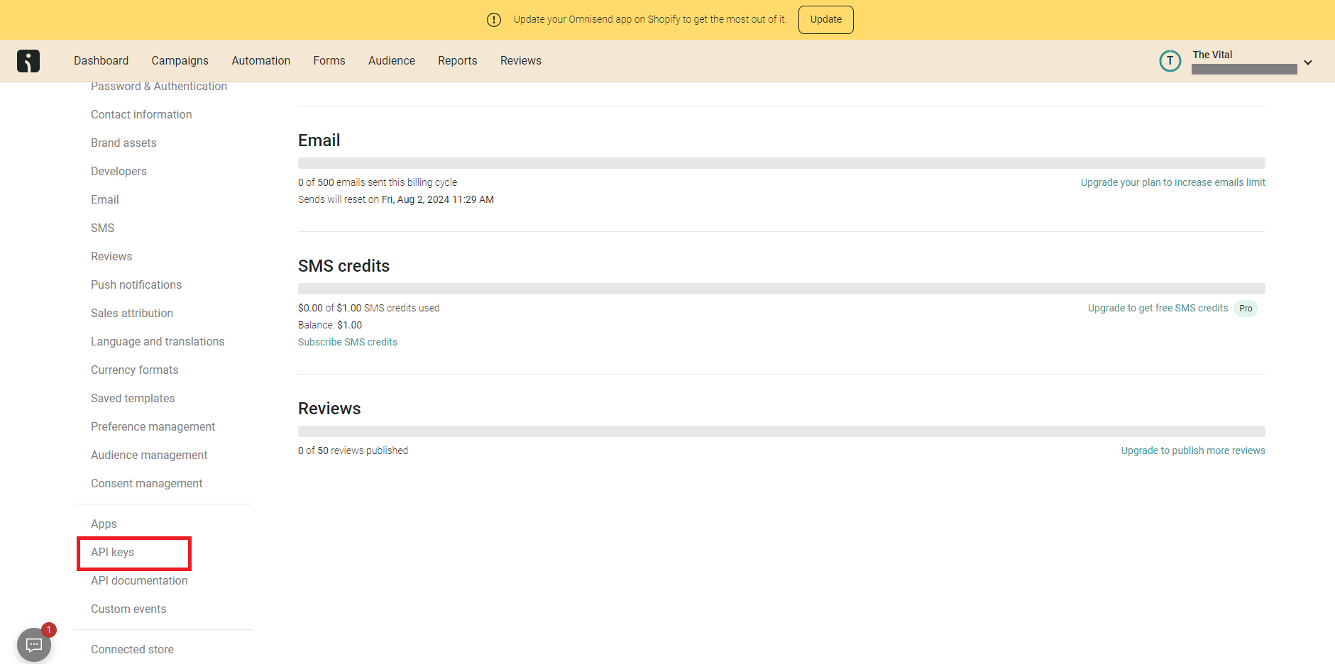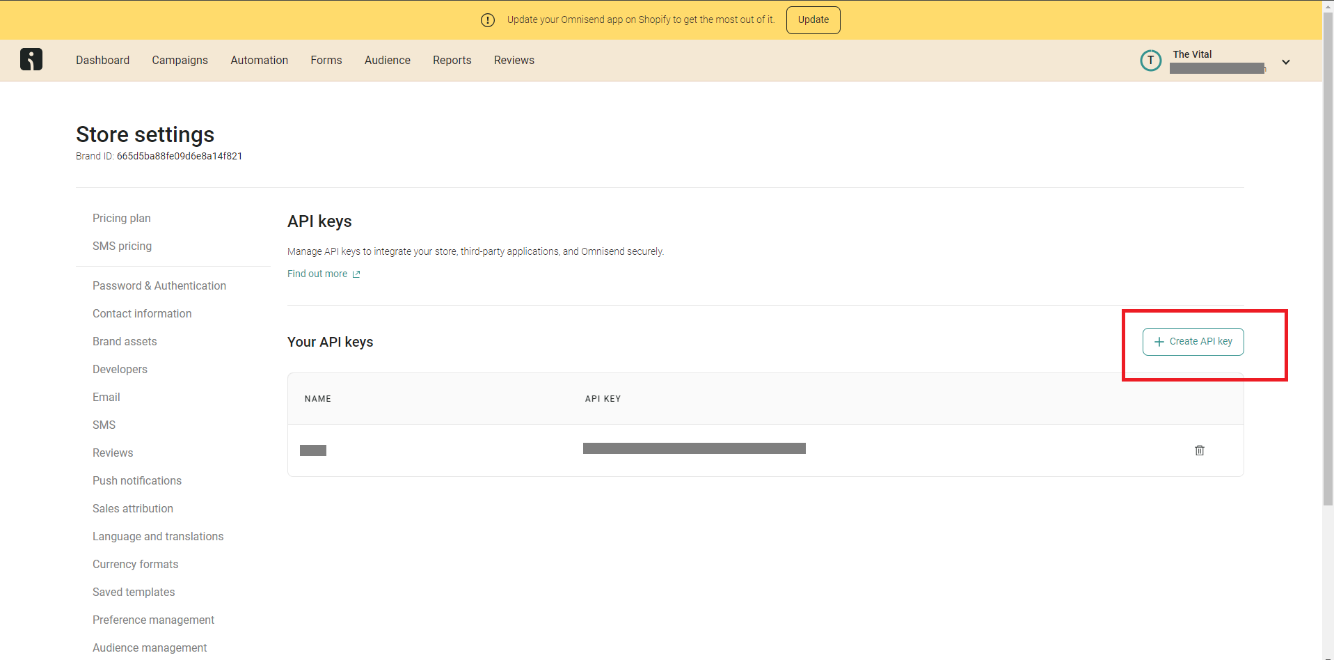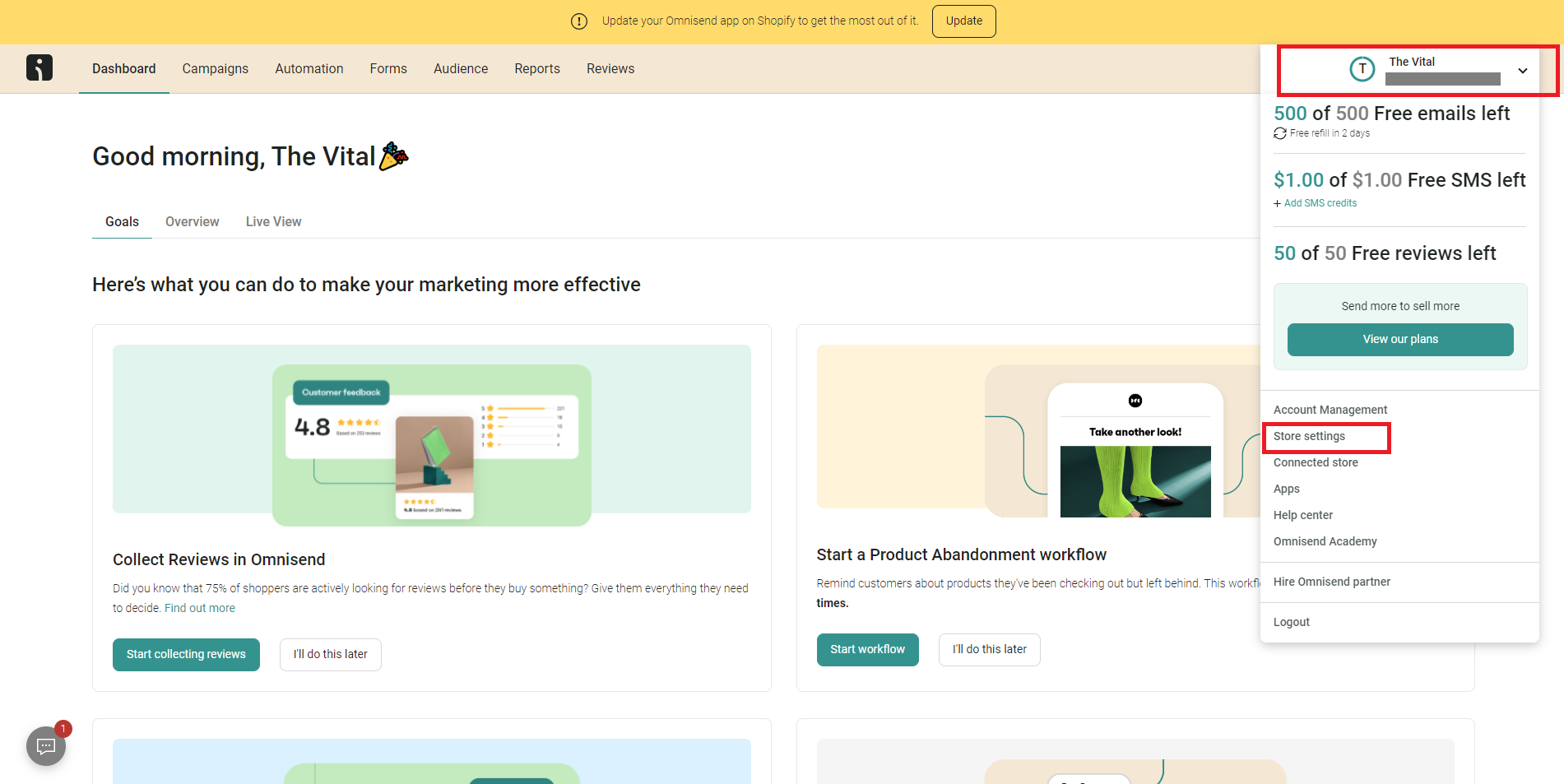 Step 2: Go to your Omnisend account, click on your username and then click on Store setting.