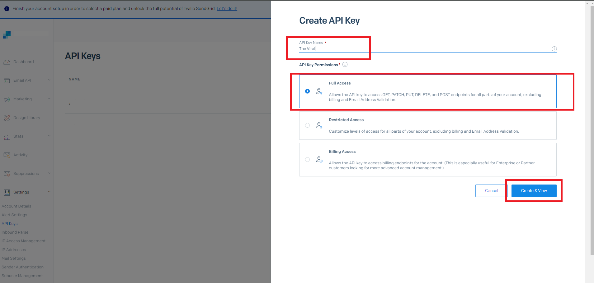 Step 4: Give name to API Key and check on Full Access and click on Create & View.