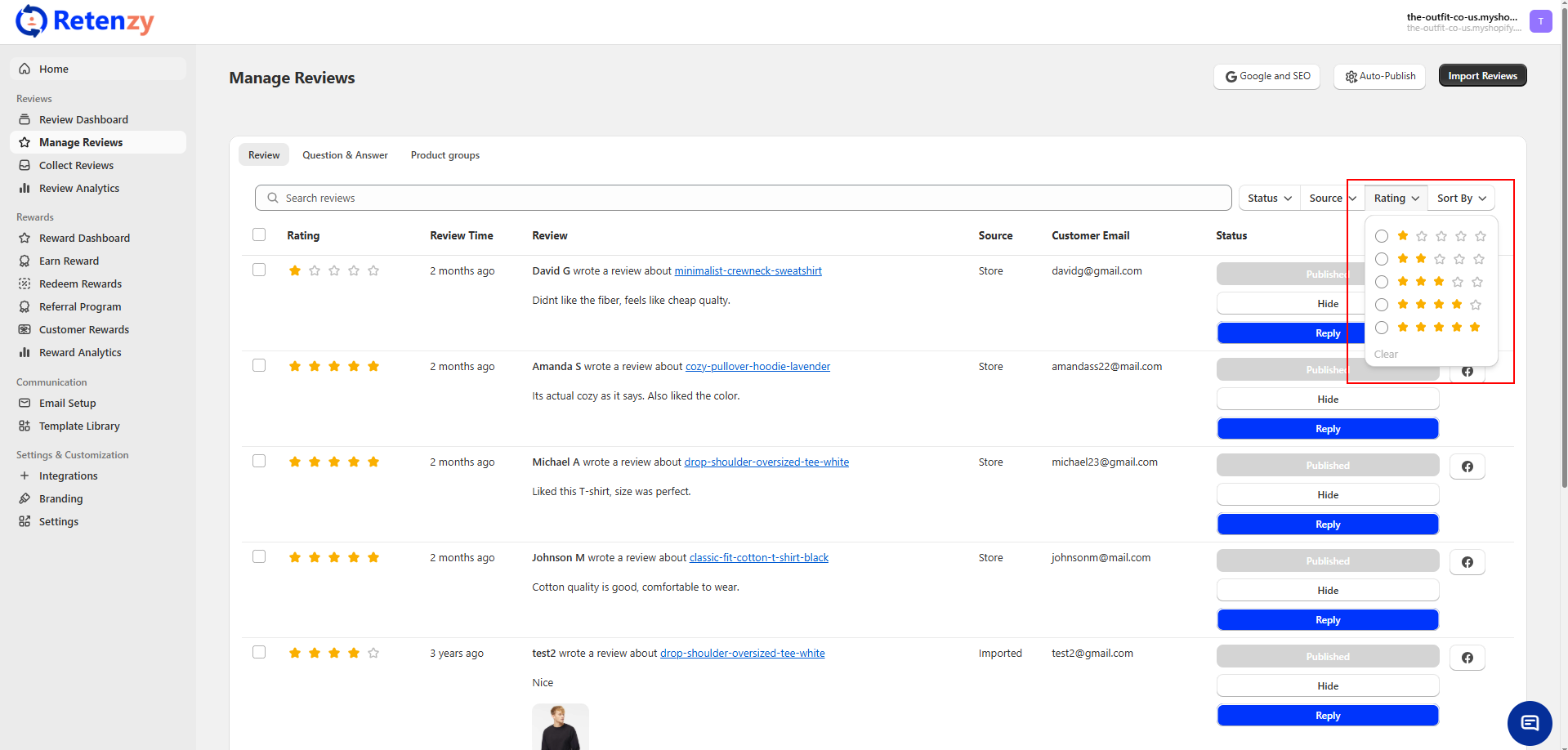 On the Manage Review page, locate the Rating filter option on the right side of the search bar.