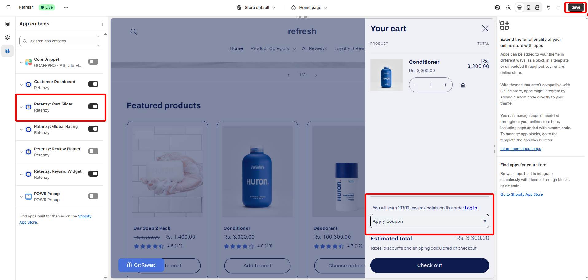 Step 4: Once loaded, you’ll see the Reward Points section appear in your cart slider after that, just click on save button