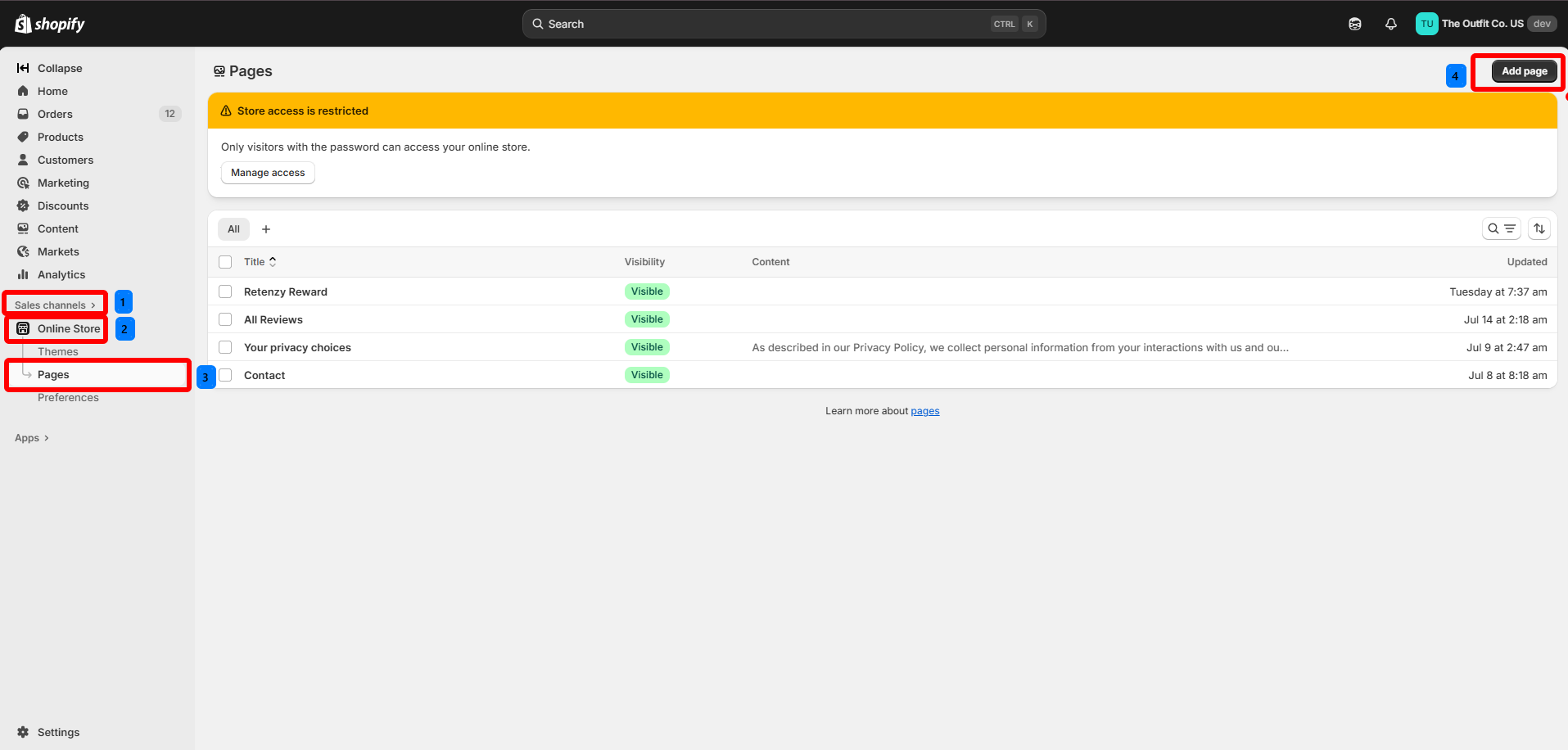 - To create page go to your store admin dashboard and access "Sales channels" then click on "Online store"