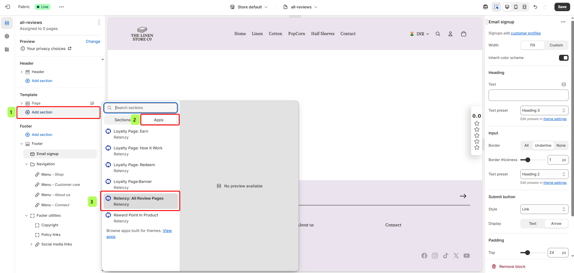 - Then click on "Add section" then select "Apps" then click on "Retenzy : All Reviews Page"